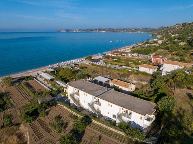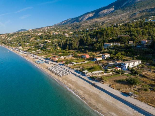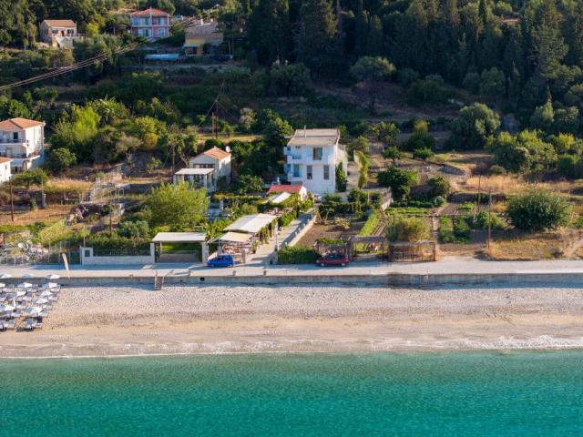 A közkedvelt apartmanház közvetlenül a fehér, finomhomokos/kavicsos tengerparton fekszik, a ház előtti terület kavicsos, a vízben már homokos. A kétszintes épület alsó szintje a ház tulajdonosának magánterülete. A házhoz tartozó kertben található a tulajdonos tavernája, ami híres a magas színvonalú, jó alapanyagokból készült ételeiről, itt reggeli, ebéd, vacsora a helyszínen kérhető. A parti sétányon tavernák, kávézók, mini szupermarket gyalogosan elérhető |