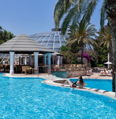 | Az ultra all inclusive program tartalmazza: reggeli (7:00-10:00), ebéd (12:30-14:30) és vacsora (19:00-21:30) bőséges büfé formájában - Ambrosia étterem. Napközbeni snackek a Gallery Caféban (11:00 - 00:00) - gyros, pizza, hot dog, chips, szendvicsek, saláták, gyümölcsök stb. Prémium alkoholos italok; alkoholmentes és alkoholos, helyben készített italok (10:00-00:00 - Terrace Bar - csak italok; 19:00-00:00 Dome Club Bar) a szálloda által kijelölt helyeken és időpontokban. A szálloda az éttermekben formális öltözéket igényel (uraknak hosszú nadrág). Májustól októberig Family Club büfé étterem: meleg és hideg snack ételek, palacsinta és más desszertek. |